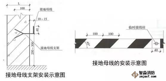 2、配電室接地母線:用扁鋼制作接地母線支架,支架末端加工成燕尾形,埋設(shè)深度不小于50mm,出墻平直長度為10~15mm,上彎立面長度為40mm。支架安裝間距為1m,離地面高度為300mm。接地母線應(yīng)先調(diào)直或煨彎后焊接在支架上,接地母線搭接長度大于等于扁鋼寬度的2倍且三面施焊。每房間設(shè)不小于2處的蝴蝶螺母作為臨時接線柱,過門處暗敷埋設(shè),轉(zhuǎn)角用扁鐵煨制圓弧形,煨彎半徑R≥100mm,穿墻板處加設(shè)套管保護。接地母線應(yīng)刷45°斜向黃綠相間標識油漆,條紋間距100mm,臨時接線柱兩側(cè)各留20mm寬度不刷漆。