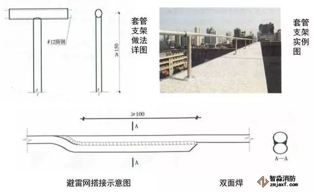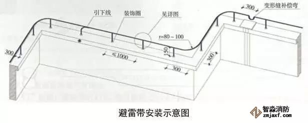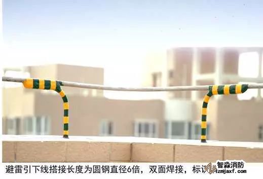 3、圓鋼避雷帶敷設(shè):按設(shè)計位置彈線、定位,一般情況下,避雷帶應(yīng)居女兒墻(屋脊)中心,當女兒墻寬度大于300mm時,支架布設(shè)于距外沿150mm處,距變形縫、轉(zhuǎn)彎300mm處設(shè)支架,直線段支架均勻分布,間距不大于1m;支架埋深不小于80mm,出女兒墻頂面不小于150mm,調(diào)整、校正支架的垂直度,根部套不銹鋼裝飾圈并用耐候膠密封固定。圓鋼調(diào)直后敷設(shè)在支架上,轉(zhuǎn)彎、搭接、變形縫處圓鋼煨彎加工,轉(zhuǎn)彎處煨彎半徑為80~100mm,搭接處一端鋼筋煨乙字彎,與另一端圓鋼上下搭接,搭接長度為100mm,搭接點宜設(shè)在離支架不小于200mm位置處,雙面施焊,焊縫連接飽滿,焊渣清理干凈,焊接點應(yīng)先刷防銹漆,再刷銀粉漆,防腐處理到位;變形縫處鋼筋煨成向下半圓形。將防雷引下線可靠焊接在避雷帶上。拉通線校正避雷帶的高度、平直度。