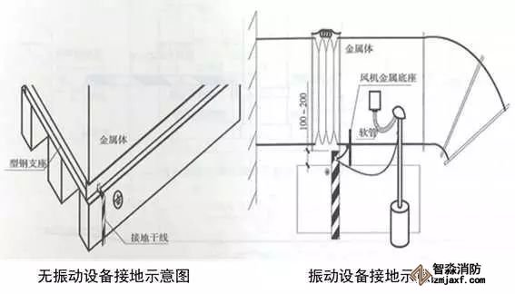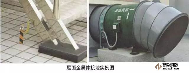 6、屋面金屬體接地:用-25x4的鍍鋅扁鋼從就近的避雷網(wǎng)引接地線,接地扁鋼一端與避雷網(wǎng)連接,另一端在金屬體附近地面引出,應(yīng)高于設(shè)備基礎(chǔ)100~200mm。無振動設(shè)備在金屬體上直接焊接,有震動設(shè)備和非碳鋼金屬體應(yīng)用編織軟銅線兩端壓端子跨接,編織軟銅線外套黃綠雙色熱縮套且熱縮。伸出地面的接地母線應(yīng)刷黃綠相間油漆。體積較大的金屬體應(yīng)做不小于2處的接地,高度高于避雷網(wǎng)時,應(yīng)加避雷針保護。接地母線附近應(yīng)做接地標識。