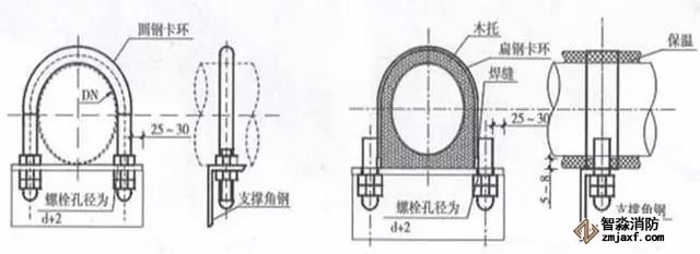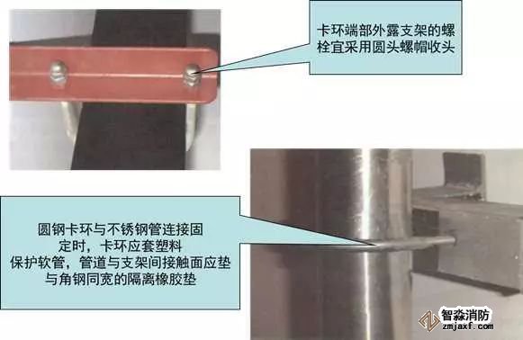 選擇與管徑匹配的卡環(huán),卡環(huán)安裝固定螺栓孔應(yīng)保證管道順直且居卡環(huán)中間,卡環(huán)與管道應(yīng)接觸緊密。圓鋼卡環(huán)與不銹鋼管、銅管連接固定時,卡環(huán)應(yīng)套塑料保護軟管,管道與支架間接觸面應(yīng)墊與角鋼同寬的隔離橡膠墊。扁鋼卡環(huán)應(yīng)與木托同寬,與螺栓應(yīng)滿焊連接;在與支架連接處應(yīng)垂直,扁鋼端部與支架宜留有5~8mm收縮余量,卡環(huán)端部外露支架的螺栓宜采用圓頭螺帽收頭,油漆涂刷應(yīng)均勻。