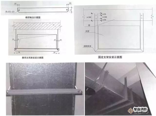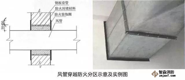 2、風(fēng)管穿越防火分區(qū)做法:用2mm厚鋼板加工制作風(fēng)管套管,套管接縫應(yīng)滿焊,套管尺寸比風(fēng)管四周尺寸大30~50mm,套管長度與墻面厚度一致。安裝完后用防火材料將套管與風(fēng)管間隙填塞密實。用2mm厚、30~50mm寬黑色橡膠裝飾圈收口,裝飾圈角部45°拼接。風(fēng)管穿越防火分區(qū)處必須設(shè)防火閥,防火閥距墻分隔墻間距不大于200mm,風(fēng)管長邊大于630mm時,宜在防火閥兩側(cè)設(shè)單支吊架。