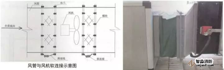 3、風(fēng)管與風(fēng)機軟連接:確定風(fēng)管與風(fēng)機之間的距離和同心性,距離要求150~200mm,風(fēng)管、風(fēng)機同心徑;制作軟接兩端法蘭,中低壓系統(tǒng)法蘭螺栓孔間距120~150mm,高壓及凈化系統(tǒng)距80~100mm,軟接長度為法蘭間距加20~30mm伸縮量,用鉚釘將軟接均勻平整的固定在法蘭上,鉚釘位置和法蘭螺栓位置對應(yīng),風(fēng)機法蘭與風(fēng)管法蘭螺栓孔對應(yīng),螺栓朝向與介質(zhì)流向一致,螺栓外露長度為2~3扣絲。屋面與防暴場所采用不小于4mm²的黃綠雙色銅芯軟線壓接銅鼻子接地跨接。成排風(fēng)機中心線應(yīng)在一條線上。