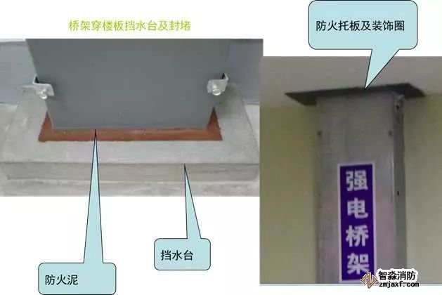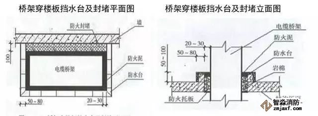 5)電井應(yīng)設(shè)門檻,橋架、插接母線在地面或穿樓板處有不低于50mm的擋水臺,橋架、插接母線穿樓板處應(yīng)做20~30mm防火封堵,頂部設(shè)置防火托板,加裝飾圈。