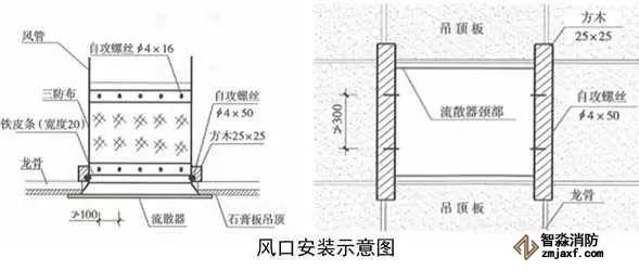 根據(jù)策劃后的圖紙,確定風(fēng)口位置,在風(fēng)口頸部用手槍鉆打眼,孔徑4mm,打眼間距不大于100mm,用自攻絲和1.5~2.0mm厚的金屬條將三防布固定到風(fēng)口頸部。方木防火防腐處理后固定在吊頂龍骨上,用自攻絲將風(fēng)口固定在方木上,自攻絲間距不大于300mm,校正風(fēng)口,與吊頂結(jié)合嚴密。