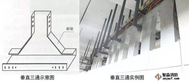 2、橋架三通安裝:根據(jù)電纜橋架走向,按照最大電纜直徑的10~15倍選擇三通形式和彎曲半徑。在距三通接口500mm處設(shè)置支架,橋架寬度大于800mm時,應(yīng)在三通底部增加支架。兩段橋架與橋架、橋架與支架之間跨接接地。