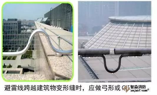 屋頂設(shè)置避雷針或避雷線,主要作用是對建筑物和屋面設(shè)備起到保護作用。其質(zhì)量控制主要為:屋面的設(shè)備、金屬構(gòu)件、金屬管道、金屬支架、電氣設(shè)備金屬外殼都必須和接地干線可靠連接。避雷線安裝應(yīng)平直,鍍鋅層完好,接頭應(yīng)采用雙面焊接,圓鋼搭接長度6倍直徑,焊接焊口須防腐處理。引下線宜采用圓鋼或扁鋼。當采用圓鋼時,直徑不應(yīng)小于8mm。當采用扁鋼時,截面不應(yīng)小于48mm2,厚度不應(yīng)小于4mm。對于裝設(shè)在煙囪上的引下線,圓鋼直徑不應(yīng)小于12mm。扁鋼截面不應(yīng)小于100mm2且厚度不應(yīng)小于4mm。避雷帶跨越建筑物變形縫時,應(yīng)設(shè)補償裝置。接閃器應(yīng)熱鍍鋅,焊接處應(yīng)涂防腐漆。在腐蝕性較強的場所,還應(yīng)加大其截面或采取其他防腐措施。
