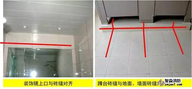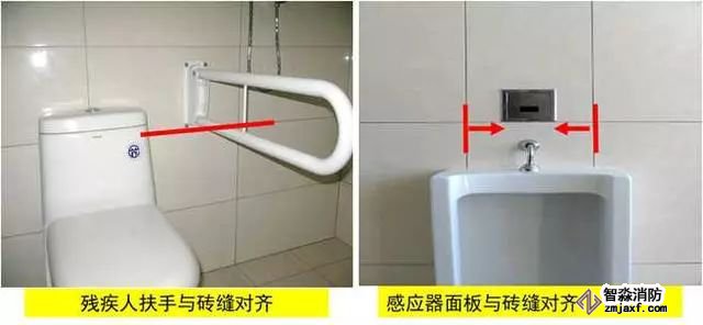 質(zhì)量控制要點:器具、排水管、配件等與墻、地面磚居中、對縫,周邊打膠光滑密實。成排器具安裝應(yīng)排列整齊,高度一致,間距均勻。