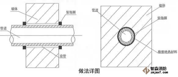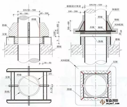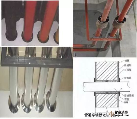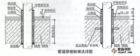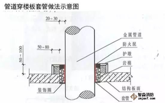 當管道穿過防火堤、防火墻、樓板時,應(yīng)安裝套管。穿防火堤和防火墻的套管長度不應(yīng)小于防火堤和防火墻的厚度,穿樓板套管長度應(yīng)高出樓板50mm,底部與樓板底面相平;管道與套管間的空隙應(yīng)采用防火材料封堵。
