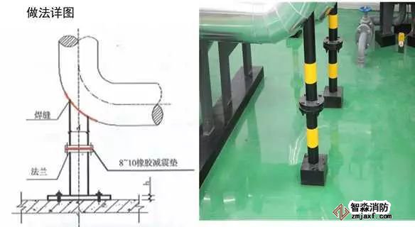 根據(jù)管道公稱直徑大小,選擇不同厚度的鋼板,加工成肋板,校正管道的垂直度,先將肋板底端焊接固定到管道周圍的支架上,再將肋板側(cè)面與管道焊接,檢查焊縫,再次校正管道垂直度,無誤后,刷防銹漆、面漆,設(shè)計要求保溫的進行管道保溫。