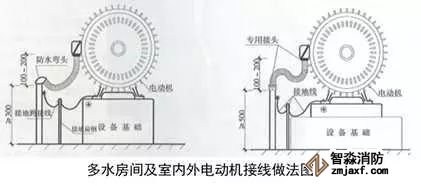 1、電源配管連接:根據(jù)電動機接線盒位置敷設(shè)電源管,成排電動機接線盒宜同向排列。電源敷設(shè)在靠近接線盒的方向,管口離地高度宜≥300mm,低于電動機接線盒中心100~200mm,室外電源管高度與接線盒中心一致,管口安裝防水彎頭。在距管口50~100mm處焊接接地螺栓。軟管管徑應(yīng)與電源管同徑,軟管應(yīng)留有適當余量,兩端采用專用管接頭盒專用盒接頭連接。導(dǎo)線壓倒接線盒內(nèi)的接線端子上。電動機底座、電源管應(yīng)與接地母線可靠連接。