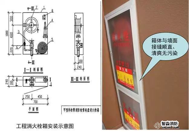 從箱門開啟側(cè)將管道接入消火栓內(nèi),栓口朝外,閥門中心距墻側(cè)面140mm(帶自救卷盤時距箱側(cè)面250mm),距箱里側(cè)表面100mm。螺紋連接時應(yīng)有2~3扣的外露絲扣,清理干凈絲扣處的麻絲,并做防腐處理。消防控制按鈕安裝在箱門開啟處、箱內(nèi)側(cè)的最上部,并注意電氣專業(yè)的配合。除箱門安裝玻璃者以及能被擊碎的透明材料外,均應(yīng)設(shè)置箱門緊急開啟的手動機構(gòu),與墻面交接清爽無污染。