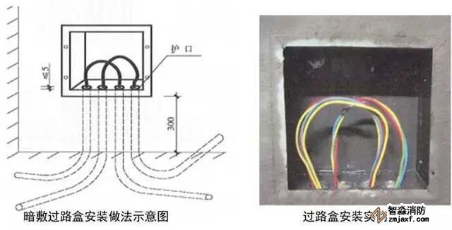 1、過路接線盒:在導(dǎo)管敷設(shè)時,按照規(guī)范要求在適當位置設(shè)置過路接線盒。過路盒安裝時距地高度宜為300mm;在結(jié)構(gòu)板內(nèi)安裝過路盒時,應(yīng)用扎絲綁緊,盒內(nèi)填充密實,表面用膠帶密封;導(dǎo)管應(yīng)垂直進入線盒,焊接管絲頭伸入線盒內(nèi)長度不大于5mm,盒子內(nèi)外鋼管鎖母上緊,(或KBG、JDG管可用盒接頭與過路接線盒連接)接地,用φ6圓鋼在焊管間、焊管與過路盒間進行接地跨接;盒內(nèi)穿線應(yīng)留有適當余量;管口加護口;安裝過路盒面板,面板緊貼墻面或頂面。