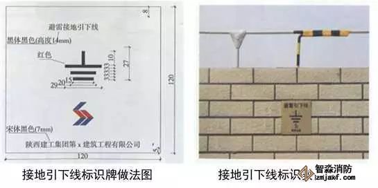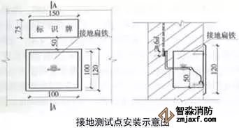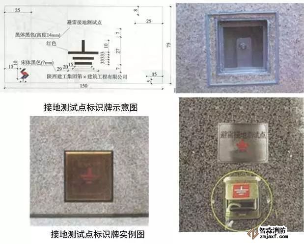 1、避雷接地測試點:預(yù)埋扁鐵鋼及100x100x50線盒,線盒與墻面平齊,鍍鋅扁鋼鉆φ12孔,安裝防松墊片及蝴蝶螺母,螺母居預(yù)埋盒中心。編織軟銅線一端連接在蝴蝶螺母上,另一端壓接銅鼻子用于接地測試。銅質(zhì)面板用螺絲固定在預(yù)埋盒上,在測試點正上方50mm處粘貼銅質(zhì)或不銹鋼標識牌,標識牌應(yīng)標明接地測試地點、接地符號、施工單位、編號,標高尺寸及位置與相鄰沉降觀測點及標識牌一致。