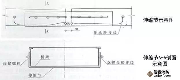 4、伸縮節(jié)安裝:當橋架經(jīng)過建筑伸縮縫或橋架直線長度大于30m(鋁合金及其他材料直線段長度大于15m)時,應(yīng)設(shè)置伸縮節(jié),伸縮節(jié)應(yīng)設(shè)置在伸縮縫位置或直線長度的中間。伸縮節(jié)兩側(cè)各設(shè)置一個支架,支架與伸縮節(jié)端部距離不大于500mm。伸縮節(jié)補償收縮襯板應(yīng)設(shè)在伸縮節(jié)外側(cè),襯板螺栓孔應(yīng)開成條形孔,襯板長度為兩個連接板長度之和加30mm,雙螺母應(yīng)位于橋架外側(cè),且不能擰緊,以保證自由伸縮。伸縮節(jié)兩端橋架應(yīng)采用軟銅線做接地跨接,接地線中間應(yīng)留有余量。