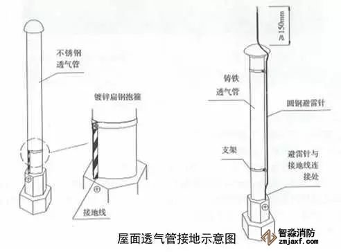 5、屋面金屬通氣管接地:采用鍍鋅扁鋼自屋面避雷網(wǎng)從透氣管根部引出,用抱箍沿透氣管固定,距根部或裝飾臺面間距300mm,根部與接地線連接,搭接長度不小于100mm,透氣管的連接部位做接地跨接。