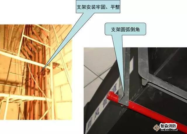 質(zhì)量控制要點:支架安裝牢固,成排支架應(yīng)排列成線、標高一致。