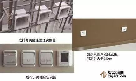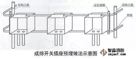 2、成排開關(guān)插座盒安裝:根據(jù)結(jié)構(gòu)500mm線和結(jié)構(gòu)墻面線,確定成排線盒的高度及位置,墻內(nèi)主筋上做標記,上下用兩根鋼筋穿接線盒,兩側(cè)加短鋼筋與結(jié)構(gòu)立筋焊接定位,盒口與模板面平齊,固定端正牢靠,間距均勻。