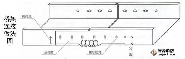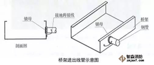 3、橋架進出線管:根據(jù)出線口位置,在橋架側(cè)面開孔,一管一孔。管端套5~6扣絲,與橋架連接內(nèi)外側(cè)采用鎖母固定,管口伸入橋架內(nèi)不大于5mm,導(dǎo)管與橋架采用不小于4mm²的軟銅線接地跨接。