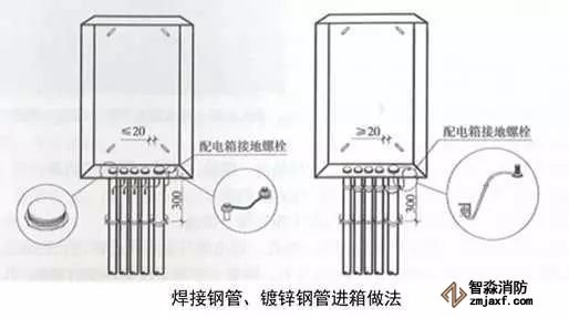 2、明配管進箱處理:對于明配導(dǎo)管,距配電箱300處進行固定;箱體采用開孔器開孔,孔徑與管徑相一致,開孔間距均勻,邊沿間距不小于20mm;進入箱體的導(dǎo)管端部套絲,采用鎖母固定,外露2~3扣絲;箱體與導(dǎo)管之間、箱體與裝設(shè)電氣部件的門之間采用編織軟銅線進行接地連接,編織軟銅線兩端壓接接線端子。