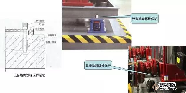 2、設(shè)備地腳螺栓防水防腐保護:對室外和多水房間安裝的設(shè)備地腳螺栓,根據(jù)設(shè)備地腳螺母大小及螺栓外露長度確定套管的直徑及高度,成排或同一區(qū)域內(nèi)螺栓外露長度應(yīng)一致,以確保套管高度一致且覆蓋螺栓頂面5mm。套管直徑與螺母直徑匹配,套管安裝后用黃油填塞套管與螺栓之間的間隙,上口與套管平齊。