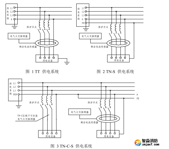 2) 在接地方式為 TN-C-S 供電系統(tǒng)中,電氣火災(zāi)監(jiān)控系統(tǒng)的監(jiān)控節(jié)點(diǎn)必須設(shè)置在 N 線與 PE 線分開以后的部分。
