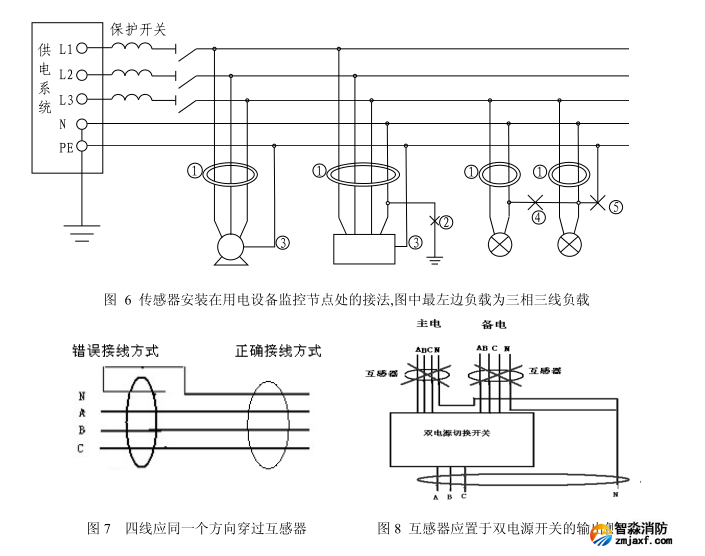 2) 每個(gè)監(jiān)控點(diǎn)處凡不通過負(fù)荷電流的電纜 PE 或 PEN不得穿過傳感器,應(yīng)如下圖中標(biāo)③處所示。