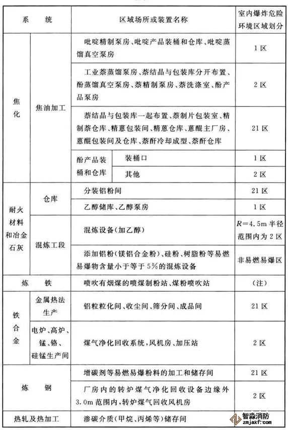 3、可能散發(fā)可燃?xì)怏w、可燃蒸氣的煤氣凈化系統(tǒng)的鼓冷、脫硫、粗苯、油庫,苯精制,焦?fàn)t地下室,煤氣燒嘴操作平臺(tái)等工藝裝置區(qū)和儲(chǔ)運(yùn)區(qū)等,在其爆炸危險(xiǎn)環(huán)境2區(qū)內(nèi)以及附加2區(qū)內(nèi)(具體如下表爆炸危險(xiǎn)環(huán)境區(qū)域劃分),應(yīng)設(shè)置可燃?xì)怏w探測報(bào)警系統(tǒng)。