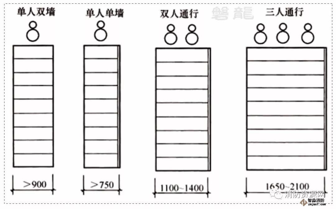 注:樓梯梯段凈寬在防火標準中是以每股人流為0.55m計,并規(guī)定按兩股人流最小寬度不應(yīng)小于1.10m,這對疏散樓梯是適用的,而對住宅套內(nèi)樓梯、維修專用樓梯外的其他平時用作日常主要交通的樓梯不完全適用,尤其是人員密集的公共建筑(如商場、劇場、體育館等)主要樓梯應(yīng)考慮多股人流通行,使垂直交通不造成擁擠和阻塞現(xiàn)象。此外,人流寬度按0.55m計算是最小值,實際上人體在行進中有一定擺幅和相互間空隙,因此本條規(guī)定每股人流寬度為0.55m+(0~0.15)m,(0~0.15)m即為人流眾多時的附加值,單人行走樓梯梯段寬度還需要適當加大,見下圖。
