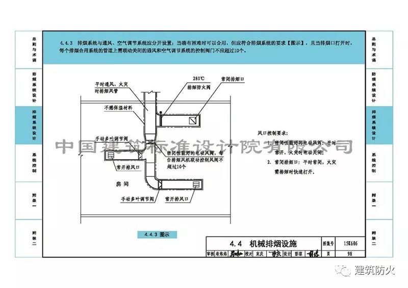 4、第98頁的“4.4.3圖示”中排煙支管上增加了“280℃排煙防火閥”,刪除了“風口控制要求”中“常閉排煙口”280℃自動關(guān)閉的字樣。