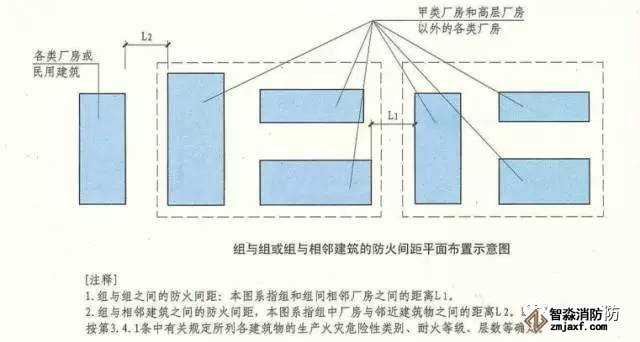 組與組或組與相鄰建筑的防火間距,應(yīng)根據(jù)相鄰兩座中耐火等級較低的建筑,按本規(guī)范第3.4.1條的規(guī)定確定。