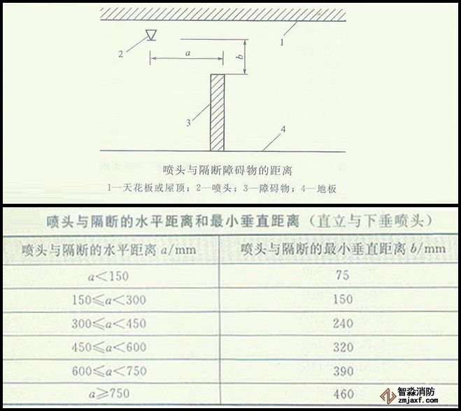 2)直立型、下垂型標(biāo)準(zhǔn)噴頭濺水盤與頂板的距離為75~150mm。