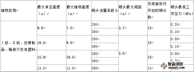 4.采用早期抑制快速響應噴頭的倉庫系統(tǒng)設計基本參數不應低于下表的規(guī)定。