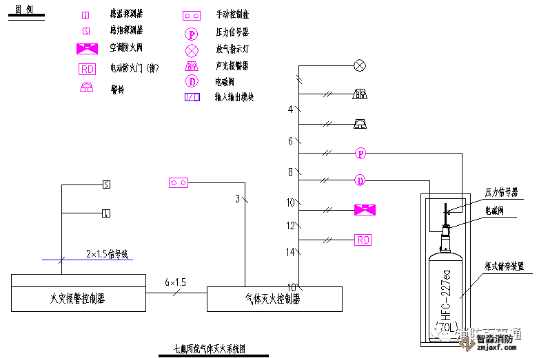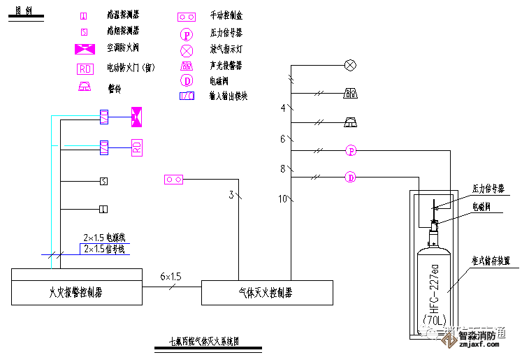 下面簡述一下該氣體滅火系統(tǒng)的組成方式,即參照《火災(zāi)自動報警系統(tǒng)設(shè)計規(guī)范》GB50116-2013第4.4.3條,氣體滅火控制器、泡沫滅火控制器不直接連接火災(zāi)探測器的組成方式,火災(zāi)報警控制器設(shè)置在消防監(jiān)控中心,防護區(qū)設(shè)置的感煙探測器和感溫探測器直接連接到消防控制中心的集中報警控制器上,消防控制中心的火災(zāi)報警控制器通過總線控制模塊聯(lián)動切除空調(diào)系統(tǒng)和防火閥,關(guān)閉防火卷簾門等;氣體滅火控制器設(shè)置在防護區(qū)的鋼瓶組附近,連接防護區(qū)內(nèi)的聲光報警器和防護區(qū)外的聲光報警器、以及啟動鋼瓶的電磁閥和氣體釋放的壓力開關(guān)信號機放氣指示門燈,現(xiàn)場緊急釋放和啟停按鈕設(shè)置在防護區(qū)門口。