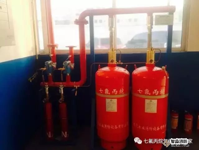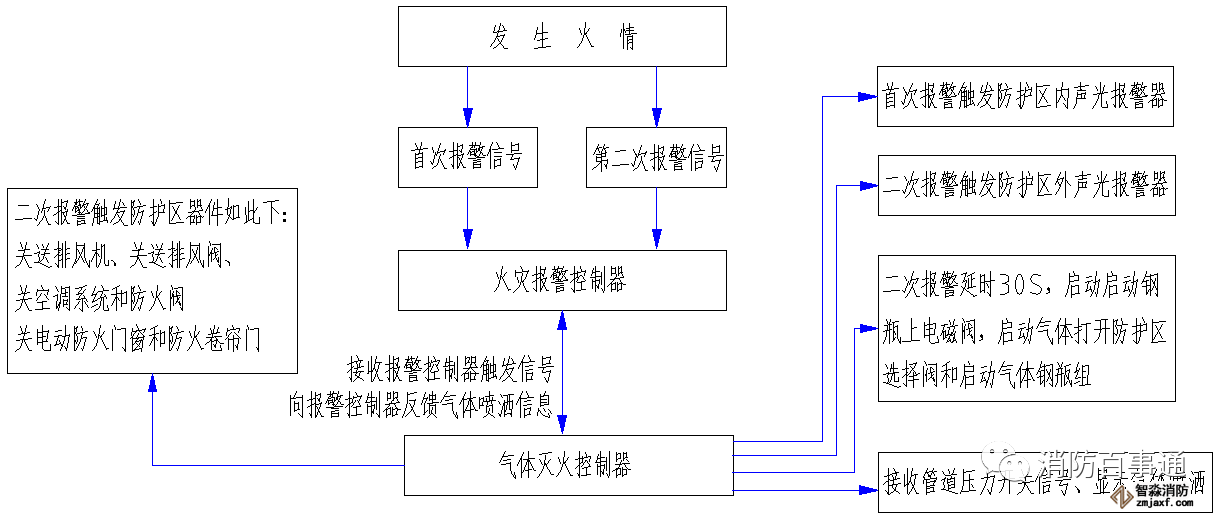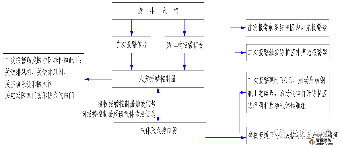 首先觸發(fā)信號防護區(qū)域內(nèi)任一設(shè)置的感煙火災(zāi)探測器作為首個聯(lián)動觸發(fā)信號后,火災(zāi)報警控制器接收到第一報警信號,同時氣體滅火控制盤接到火災(zāi)報警控制器的聯(lián)動請求,啟動設(shè)置在該防護區(qū)內(nèi)的火災(zāi)聲光警報器;再觸發(fā)感溫探測器或手動火災(zāi)報警按鈕的報警信號,火災(zāi)報警控制器接收到第二個報警信號,聯(lián)動該防護區(qū)內(nèi)的相關(guān)設(shè)備如:停止排風(fēng)機、關(guān)閉排風(fēng)閥、關(guān)閉空調(diào)電源和送風(fēng)管道上的防火閥,關(guān)閉防火門窗和降下防火卷簾門;同時氣體滅火控制盤接到火災(zāi)報警控制器的第二次聯(lián)動請求,啟動設(shè)置在該防護區(qū)外的火災(zāi)聲光警報器;延時30秒后,開啟氣體啟動鋼瓶上的電磁閥,啟動氣體通過傳動管開啟相關(guān)區(qū)域的選擇閥和打開對應(yīng)的FM200鋼瓶組,氣體噴灑到該保護區(qū)域,氣體傳送管道上的壓力開關(guān)有回答信號,同樣保護區(qū)外的“放氣勿入”指示燈點亮;氣體釋放的信息反饋到火災(zāi)報警控制器上。