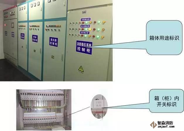 箱(柜)體標(biāo)識(shí)采用自噴漆噴涂或用不干膠紙粘貼方式進(jìn)行標(biāo)識(shí),字體寬度為40~45mm左右,內(nèi)容應(yīng)反映箱(柜)用途;箱(柜)內(nèi)開(kāi)關(guān)采用背膠紙打印粘貼在空開(kāi)上,應(yīng)反映控制對(duì)象的名稱(chēng);系統(tǒng)圖采用背膠紙打印,粘貼在箱(柜)門(mén)內(nèi)側(cè)合適位置,宜采用A4紙規(guī)格尺寸。