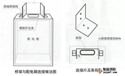 3、橋架與配電箱的連接:配電箱頂部劃線、鉆孔,用電鋸開(kāi)條形孔,清理孔邊沿毛刺,孔兩端為弧形,兩端尺寸小于橋架寬度10mm左右,厚度小于等于橋架厚度的80%,孔中心與橋架中心對(duì)應(yīng),開(kāi)孔處補(bǔ)漆,孔周邊粘貼橡膠條護(hù)口。箱體與橋架用1~1.5mm厚、90°的橋架連接片連接,連接螺栓絲頭朝外,加設(shè)專(zhuān)用墊片,刃面朝向橋架連接片,螺栓外露2~3扣絲。橋架與箱體采用4mm²黃綠雙色多股軟銅線或編織軟銅線接地跨接。