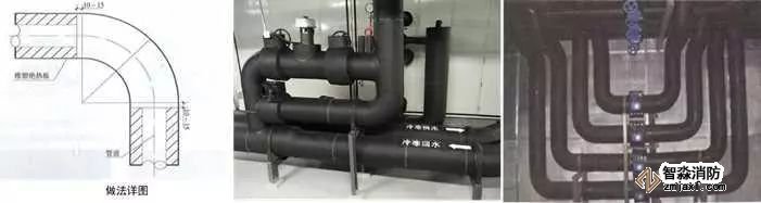 2、保溫管道穿墻處理:保溫管道穿墻、板時(shí),保溫層應(yīng)連續(xù)。應(yīng)采用橡塑保溫管(板)進(jìn)行穿墻、穿樓板保溫,用橡塑專(zhuān)用膠粘接牢固,接縫嚴(yán)密,兩端與墻面平齊,對(duì)接嚴(yán)密平整,兩側(cè)加牢固規(guī)整裝飾圈保護(hù)。保溫管(板)與墻、板面根部應(yīng)粘貼裝飾圈,接縫應(yīng)放在頂部或正視不明顯處,裝飾圈寬度20~50mm。