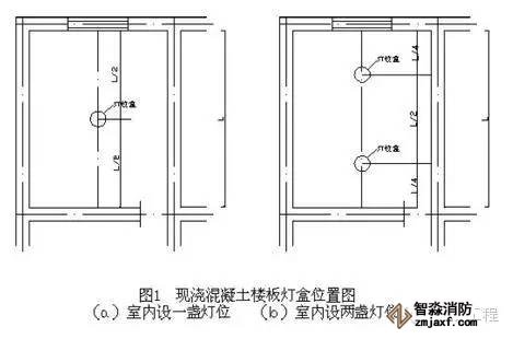 ⑴在配管前應(yīng)按設(shè)計(jì)圖紙確定好配電設(shè)備、各種箱、盒及用電設(shè)備位置。在樓板內(nèi)配管時(shí),在土建摸板支設(shè)完畢后,根據(jù)設(shè)計(jì)圖紙?jiān)诿迳嫌眉t油漆標(biāo)注燈具、插座、探測(cè)器、接線(xiàn)盒、配電箱的位置。當(dāng)室內(nèi)只有一盞燈時(shí),其燈位盒應(yīng)設(shè)在縱橫墻(或梁)凈尺寸中心線(xiàn)的交叉處;有兩盞燈時(shí),燈位盒應(yīng)設(shè)在短軸線(xiàn)墻(或梁)凈尺寸中心線(xiàn)與長(zhǎng)軸線(xiàn)墻(或梁)凈尺寸1/4 的交叉處,如圖1 所示。公共建筑走廊照明燈具,應(yīng)按其頂部建筑結(jié)構(gòu)不同,來(lái)合理地布置燈位盒的位置,當(dāng)走廊頂部無(wú)凸出樓板下部的梁時(shí),除考慮好樓梯對(duì)應(yīng)處的燈位盒外,其他燈位盒宜沿走廊中心線(xiàn)均勻分布,如走廊頂部有凸出樓板下部的梁,確定燈位時(shí),應(yīng)考慮到燈位與梁的位置關(guān)系,燈位盒與梁之間的距離應(yīng)協(xié)調(diào),均勻一致,力求實(shí)用美觀。