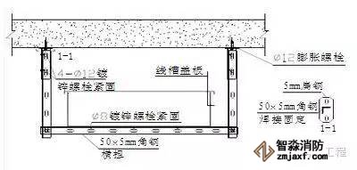 3.線(xiàn)槽橋架在跨越防火分區(qū)及線(xiàn)槽穿樓板的部位做防火封堵處理。封堵板用2mm厚防火板,具體做法如圖所示: