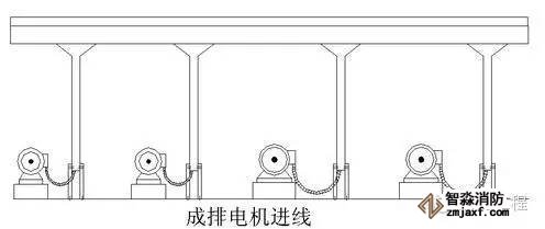 5.機(jī)房因?yàn)樵O(shè)備多,管線(xiàn)及橋架縱橫交錯(cuò),施工時(shí)應(yīng)盡量做好綜合布置,成排電機(jī)橋架進(jìn)線(xiàn)示意如圖: