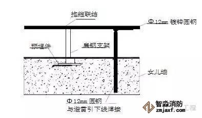 1.本工程在建筑物頂屋面女兒墻上與挑檐上,裝設(shè)Φ10鍍鋅圓鋼做避雷帶 連接條,所有高出屋面的設(shè)備及物體,均采用Φ16鍍鋅圓鋼固定在設(shè)備及物體的頂端作避雷針,采用Φ10鍍鋅圓鋼,一端與避雷針焊接,另一端與屋面女兒墻上避雷帶焊接
