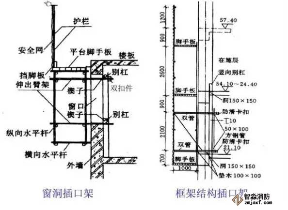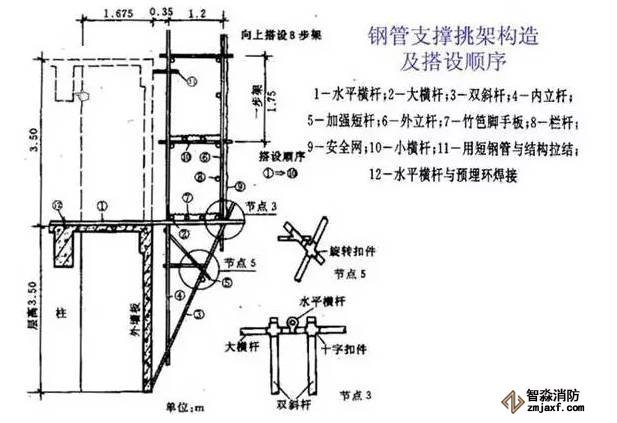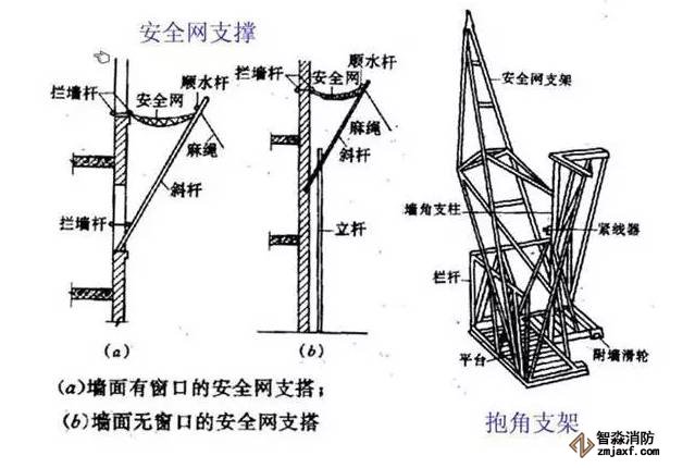 其他用鋼管線條懸挑,在多層建筑可以使用,但注意對固定位置要控制好,鋼管的傾斜角度,拉結(jié)都必須控制,不安全因素也比較多,最好還是用使用。