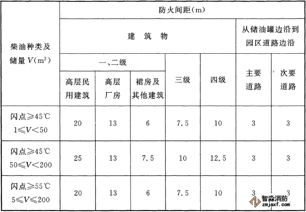 7、當(dāng)單罐柴油容量不大于50m³,總柴油儲(chǔ)量不大于200m³時(shí),直埋地下的臥式柴油儲(chǔ)罐與建筑物和園區(qū)道路之間的最小防火間距除應(yīng)符合下表5的規(guī)定外,并應(yīng)符合現(xiàn)行國(guó)家標(biāo)準(zhǔn)《建筑設(shè)計(jì)防火規(guī)范》GB 50016、《汽車加油加氣站設(shè)計(jì)與施工規(guī)范》GB 50156和《石油化工企業(yè)設(shè)計(jì)防火規(guī)范》GB 50160的有關(guān)規(guī)定。