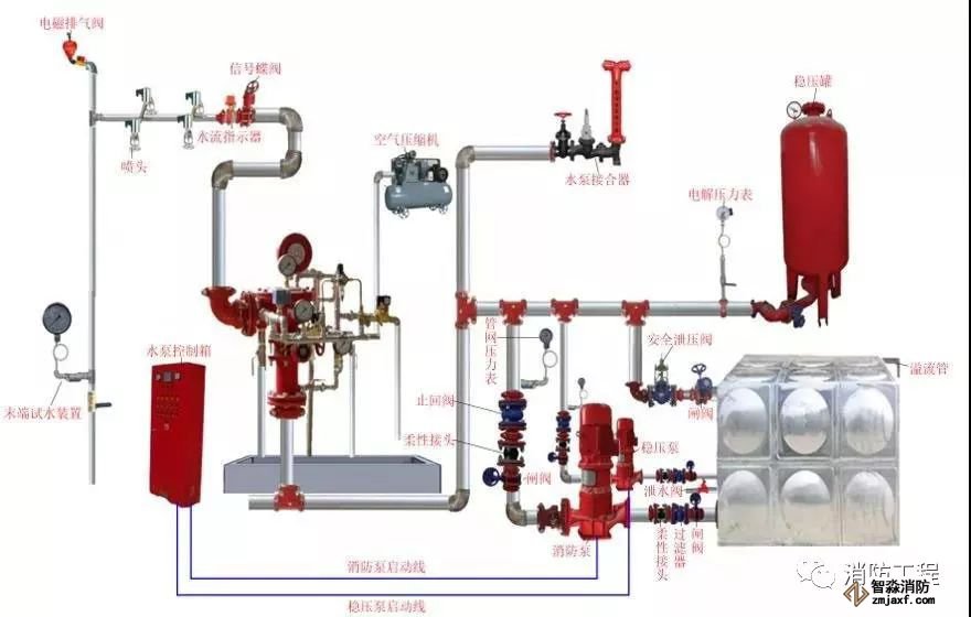 預(yù)作用系統(tǒng)在準(zhǔn)工作狀態(tài)時(shí)配水管道內(nèi)不充水,由火災(zāi)自動(dòng)報(bào)警器自動(dòng)開啟預(yù)作用閥后,轉(zhuǎn)換為濕式系統(tǒng),預(yù)作用系統(tǒng)由閉式噴頭、預(yù)作用閥組、充氣設(shè)備(不是必須有)、水流報(bào)警裝置、供水設(shè)施及供水配水管道等組成。