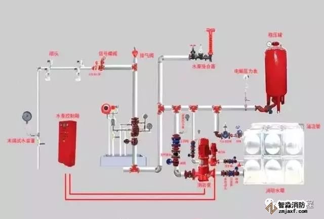 (1)消防給水基礎設施:包括消防水池、消防水泵、消防水箱、增壓穩(wěn)壓設備等。該設施的主要任務是為系統(tǒng)儲存并提供滅火用水。