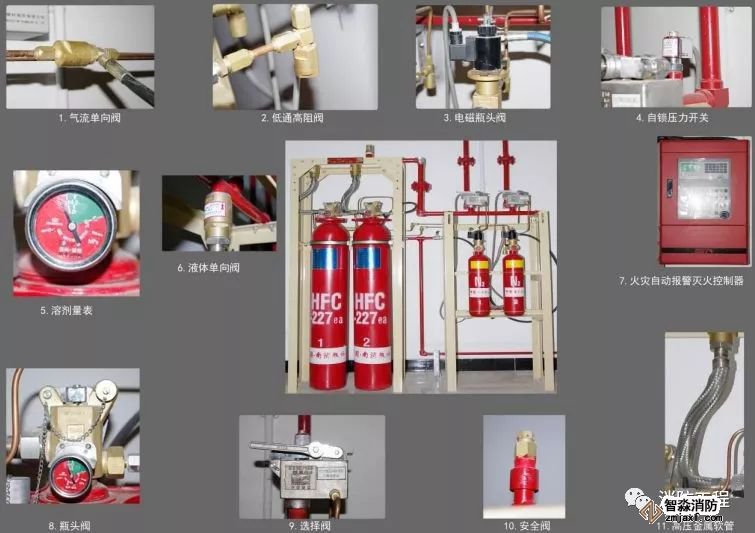 滅火系統(tǒng)主要由氣流單向閥、低通高阻閥、電磁瓶頭閥、自鎖壓力開關、溶濟量表、液體單向閥、氣體報警滅火控制器、瓶頭閥、選擇閥、安全閥、高壓金屬軟管等設備組成。