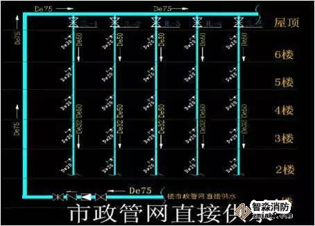 當(dāng)市政供水管網(wǎng)接入到分店屋頂(或最高樓層,管徑De90以上),出水口的壓力能夠長(zhǎng)期穩(wěn)定在0.15MPa以上時(shí),則可采取此種方式直接供水。