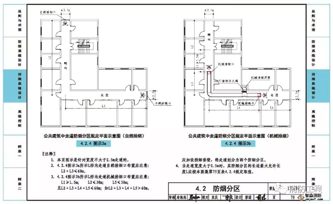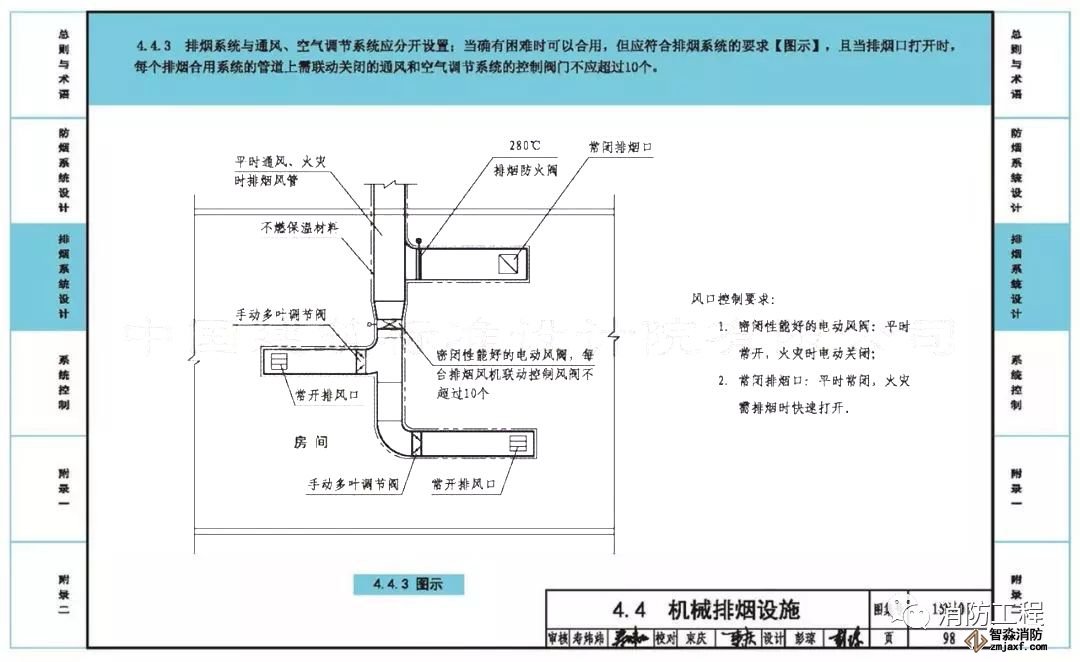 4、第98頁的“4.4.3圖示”中排煙支管上增加了“280℃排煙防火閥”,刪除了“風口控制要求”中“常閉排煙口”280℃自動關(guān)閉的字樣。