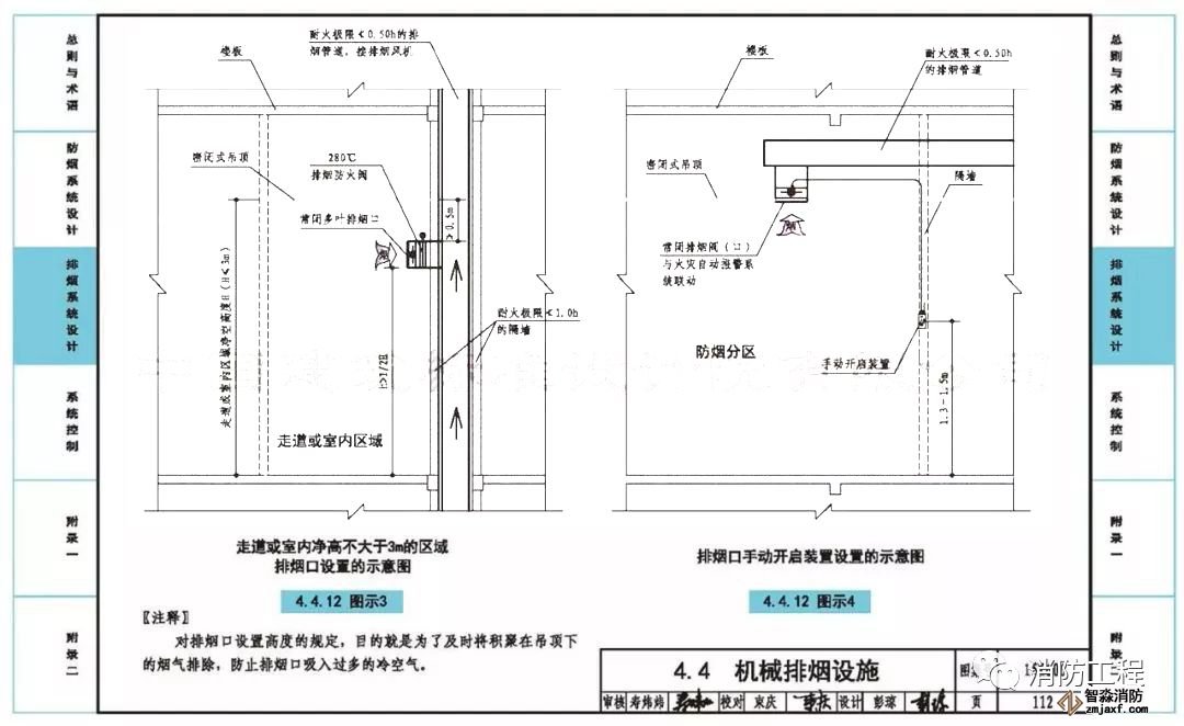 5、第112頁的“4.4.12圖示3”中側(cè)墻上安裝常閉多葉排煙口前,排煙支管上增加了“280℃排煙防火閥”。
