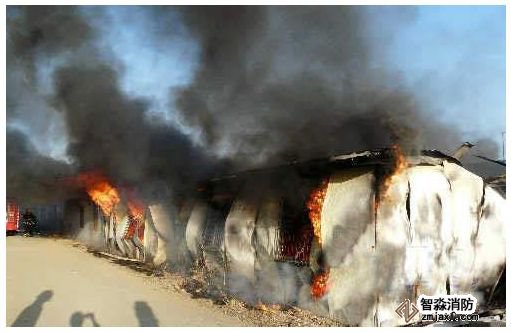目前,有些建筑工地貪圖價格便宜,用聚苯乙烯或聚氨酯為芯材的彩鋼板搭建工人臨時住宅,這種材質的彩鋼板房燃點極低,阻燃性差。一旦發(fā)生火災,火勢發(fā)展快,蔓延迅速且燃燒猛烈。因鋼結構建筑空間跨度大,可燃物料多,極易形成大面積火災。